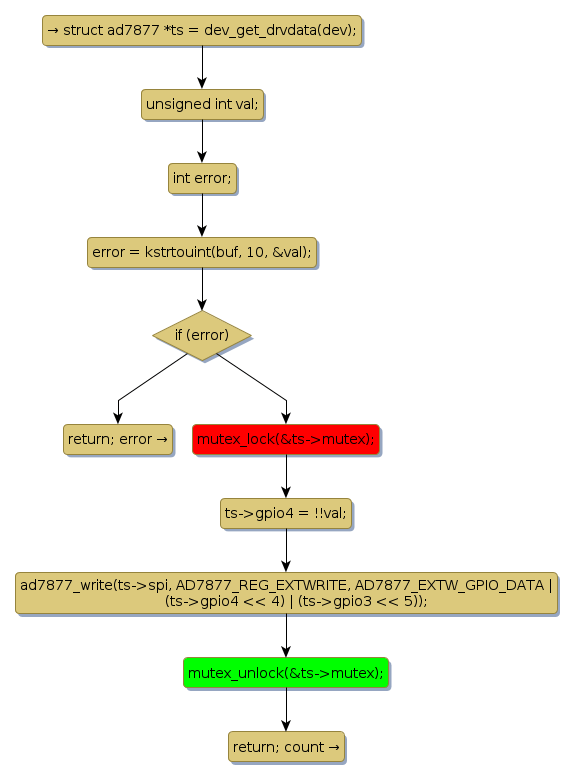 mutex lock @ [14631+23+/linux-3.19-rc1/drivers/input/touchscreen/ad7877.c]